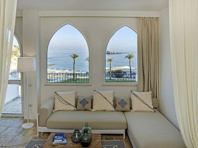 Meerblick-Junior-Suiten (KUM): 31-35 qm, Meerblick, optisch getrennter Wohn-/Schlafbereich, Doppelbett, 2 Sofabetten, 1 Bad, Dusche, WC, Bademantel (kostenfrei), Badeslipper, Haartrockner, Klimaanlage kostenfrei, individuell regulierbar, Minibar kostenpflichtig, Safe (kostenfrei), 1 TV (Sat-TV, Flachbildschirm), Telefon, WLAN, kostenfrei, Balkon oder Terrasse