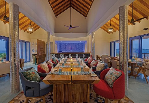 All Inclusive: Frühstück (Buffet), Mittagessen (Buffet), Abendessen (Buffet), Getränke kostenfrei (Softdrinks, Mineralwasser, Kaffee/Tee, Bier, Säfte, Mocktails, Hauswein, Cocktails, Sekt, Spirituosen, 9-1 Uhr), Snacks, Minibar (Auffüllung täglich, Softdrinks, Mineralwasser, Bier), ab 4 Nächten Aufenthalt 1 Abendessen in einem der beiden à-la-carte-Restaurants, ab 8 Nächten Aufenthalt 2 Abendessen und ab 14 Nächten Aufenthalt 3 Abendessen im à-la-carte-Restaurant, 2 Bootsausflüge pro Gast/Aufenthalt (traditionelles Angeln am Morgen und Dhoni-Fahrt zum Sonnenuntergang)