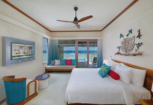 Sunrise Water Villa with Pool: 81-90 qm, Villa, freistehend, Sonnenaufgangsseite, Wasserbungalow (auf Stelzen über der Lagune), Meerblick, Ankleidebereich, Dusche, WC, Bademantel, Haartrockner, Klimaanlage, Ventilator, Minibar, Auffüllung täglich, Softdrinks, Mineralwasser, Safe, TV, WLAN, Wasserkocher, Kaffee/Tee, Terrasse (möbliert), direkter Meerzugang, Privatpool